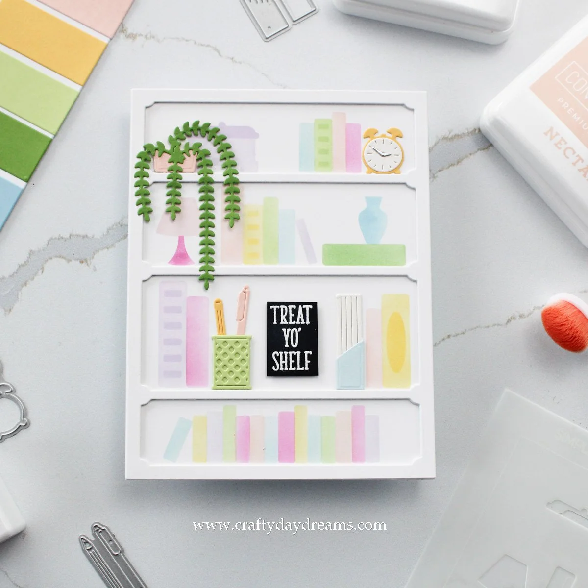 With my cardstock adhered to my grip mat, I lined up the first Simple Shelves stencil and started blending. I tried my best to get the colors spaced out in a way so that each shelf had a bit of each. This is totally not something you need to do, but my OCD was telling me I had to 😂. I repeated the same process with the second stencil, then popped my panel off my grip mat. I ended up die cutting the Simple Shelves die four times, one time with C9 white cardstock and three times with plain white cardstock, then layered them together for a dimensional shelf layer. I glued the shelf die cut over my stenciled panel, then pulled out the Shelf Additions die set and the Shelf Add-on die set. From the Shelf Add-on die set, I die cut the clock out of Buttercup cardstock, Ivory cardstock for the clock face, and matte silver for the clock hands. I die cut the drooping plant out of Parsley and Nectar cardstock for the planter, and the magazine holder out of Ivory and Harbor cardstock. From the Shelf Additions die set, I die cut the pen cup out of Sprout cardstock, and the pens out of Buttercup and Nectar cardstocks. I love the detail these die cuts add to the shelves!